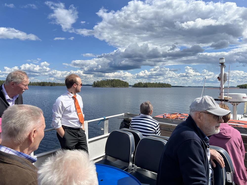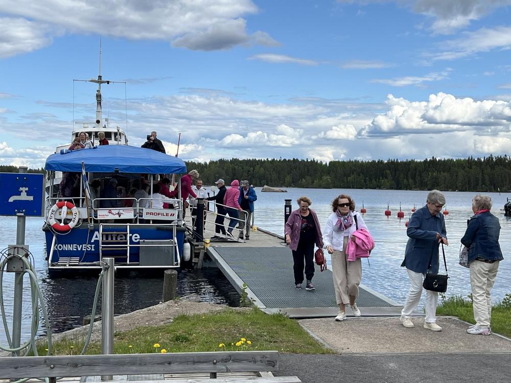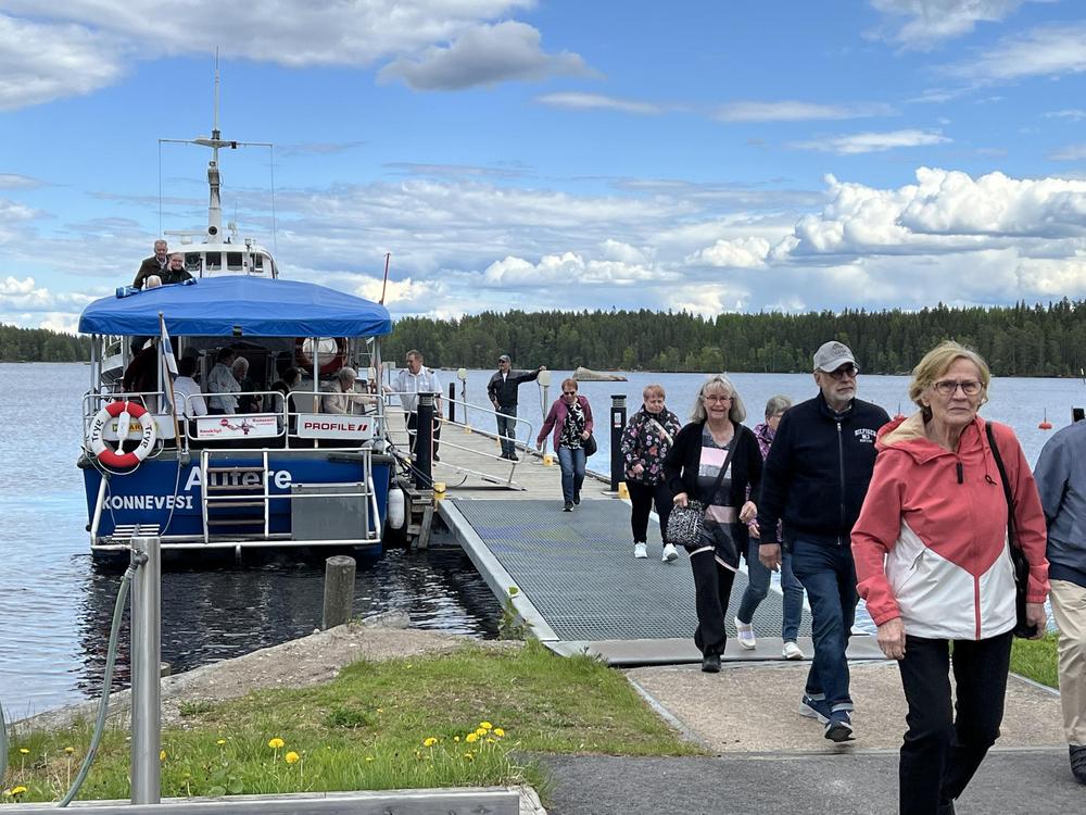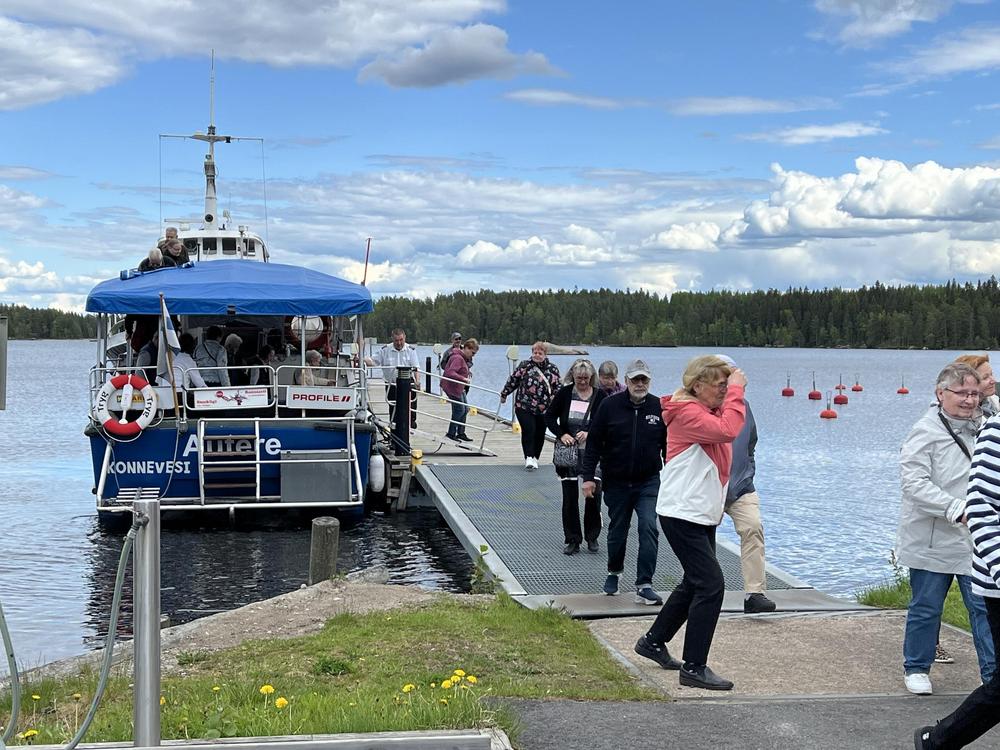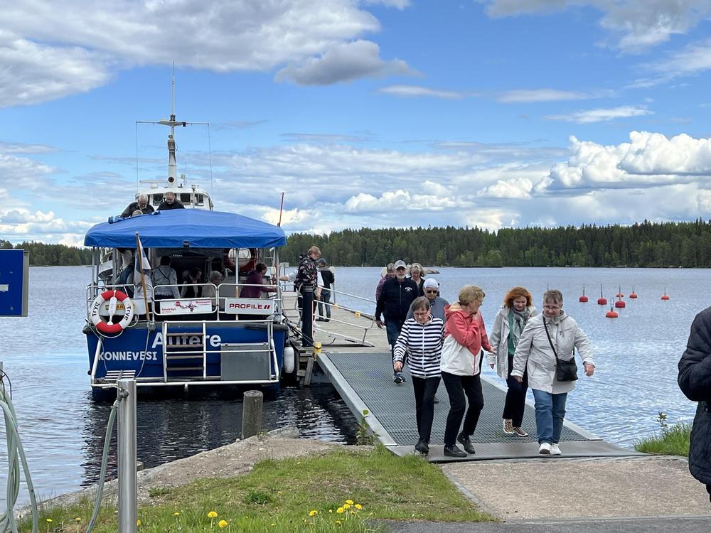 Seuraava kohteemme olikin maittava Lounas Konneveden satama-ravintolassa. Lounaan jälkeen olimmekin jo reippaina jatkamaan ulkoilua AUTERE-risteilylaivalla Etelä-Konneveden kansallispuiston kauniissa maisemissa. Kipparilla oli mielenkiintoisia kertomuksia menneiltä vuosilta. Tarinat Kekkosen "kalastusretkistä" varmaan jäi monen mieleen. Rantautumisen jälkeen saimme matkallemme loppusiunauksen Konneveden harmaagraniitti kivikirkossa.